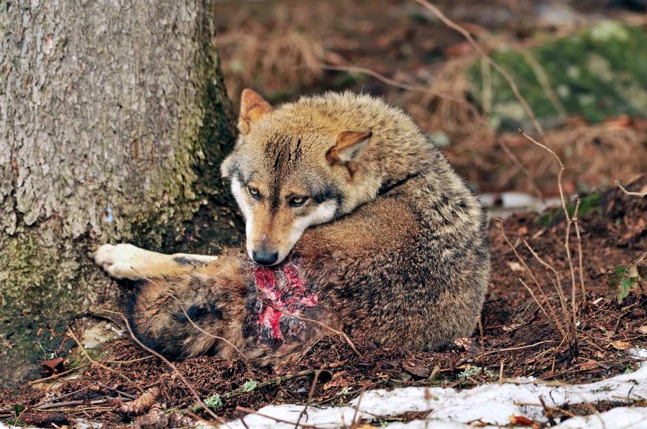 Photo: Wounded wolf (Canis lupus) licking its wounds after territorial fight, Bavarian Forest, Germany. Photograph by Arterra, Getty Images