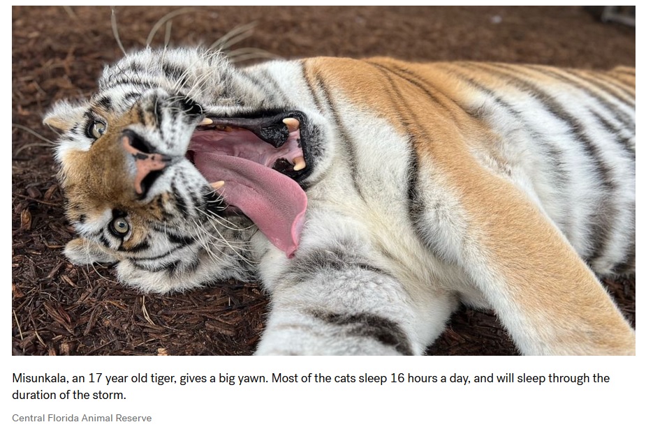 Other safety scenarios involve making sure generators are working if the power goes out and in the case of feeding… Much of the population at Carson Springs fasts for one or two days a week — something they would also do in the wild. Their keepers are planning to have them fast on Thursday, when central Florida will experience the worst of the hurricane. At Central Florida Animal Reserve, most of the residents — primarily big cats — already received a “special” early morning feed on Wednesday so they are feeling quite healthy and happy before the big storm rolls in.