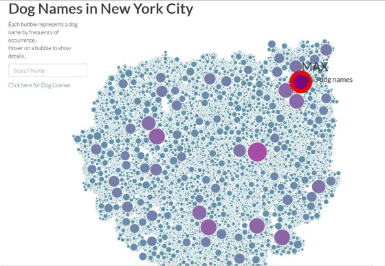 bubble map of dog names, Database of dog names gender breed in new york city, Doggy database, NYC Dog Names Bubble Chart, spay-neuter database, The dog name Covfefe does not appear in the doggy name database